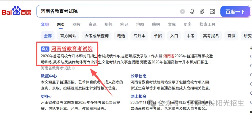 考生登录河南省教育考试院官网(http://www.haeea.cn/),或在搜索引擎中输入“河南省教育考试院”,点击带有“官方”标识的网站。