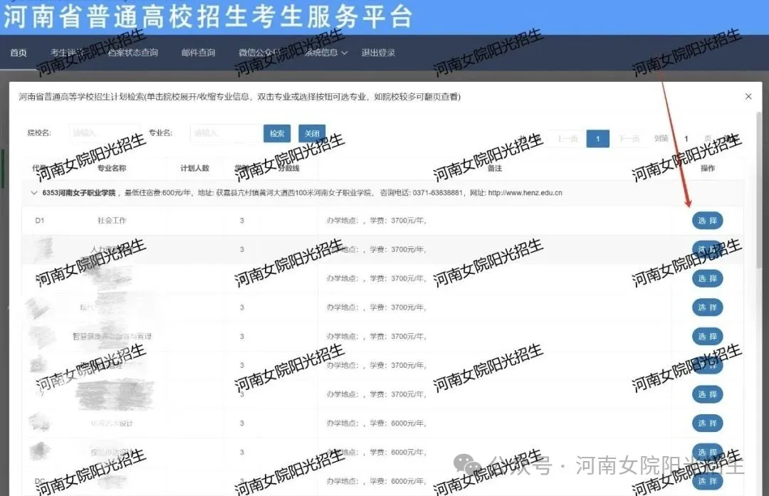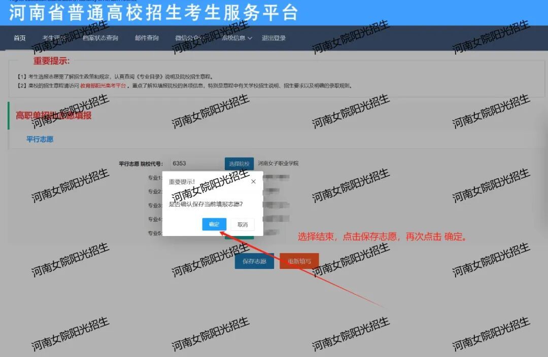 在院校、专业选择页面,考生点击所选志愿,系统会自动进行填写。(输入学校代码6353,自动显示“河南女子职业学院”,输入河南女子职业学院专业代码,系统自动会显示专业名称)。